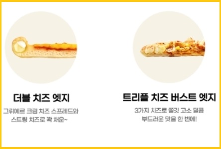 더블치즈 엣지 : 부드러운 크림 치즈에 쫄깃한 스트링치즈가 들어 있는 엣지랍니다. 도우 바깥 엣지 안에 치즈가 들어 간 것이 트리플 치즈 버스트 엣지와 다른 점이에요.