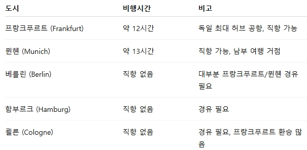 주요 도시를 기준으로 한국에서 독일 비행시간을 알아보면