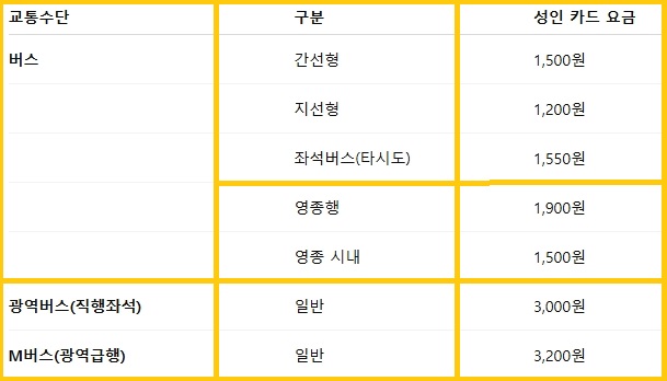- 좌석버스: 교통카드 기준 1,100원 (흰색)