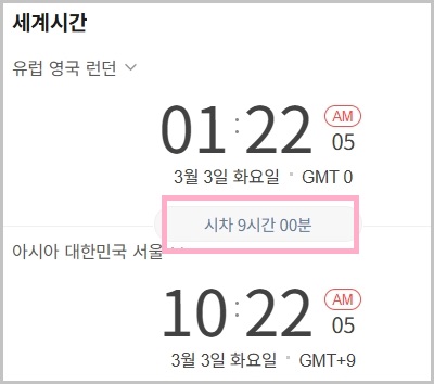 - 서머타임 해제 시 (10월 말 ~ 3월 말): 한국과 9시간 차이